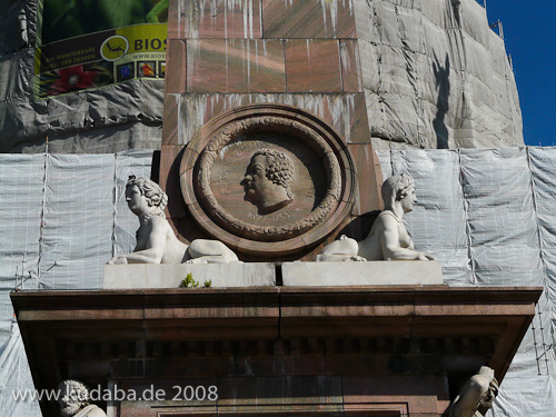 Obelisk auf dem Alten Markt von Georg Wenzeslaus von Knobelsdorff, Detailansicht der Westseite mit Sphingen und Knobelsdorff-Porträt-Medaillon