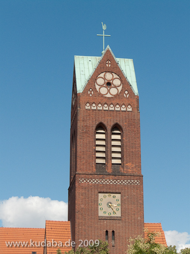 Katholische Kirche St. Antonius in Berlin-Treptow von Wilhelm Fahlbusch im neogotischen Stil erbaut, Ansicht des Kirchturms