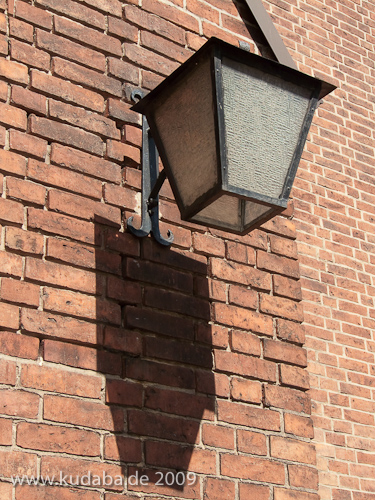 Katholische Kirche St. Antonius in Berlin-Treptow von Wilhelm Fahlbusch im neogotischen Stil erbaut, Detailansicht einer Außenlampe