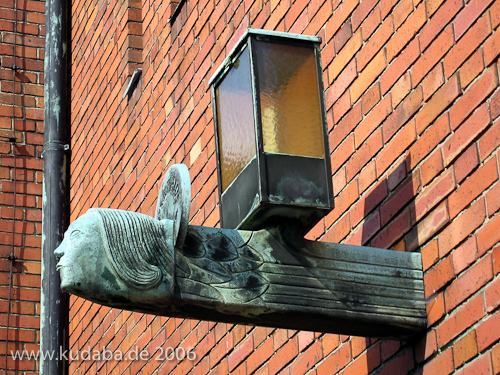 Katholische Kirche St. Bernhard in Berlin-Dahlem von Wilhelm Fahlbusch von 1932 - 1934, Detailansicht der Außenlampe in Form eines menschlichen Kopfes als Symbol für den Evangelisten Matthäus