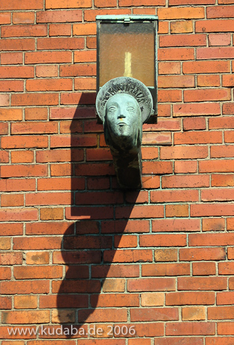 Katholische Kirche St. Bernhard in Berlin-Dahlem von Wilhelm Fahlbusch von 1932 - 1934, Detailansicht der Außenlampe in Form eines menschlichen Kopfes als Symbol für den Evangelisten Matthäus