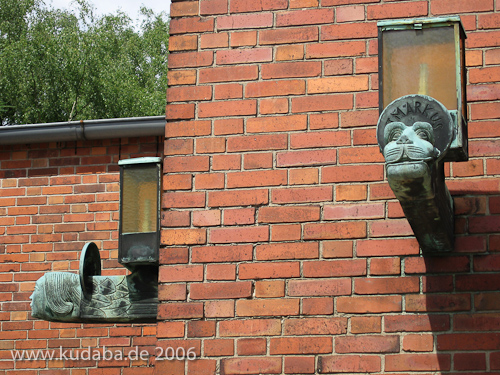 Katholische Kirche St. Bernhard in Berlin-Dahlem von Wilhelm Fahlbusch von 1932 - 1934, Detailansicht zweier Außenlampe
