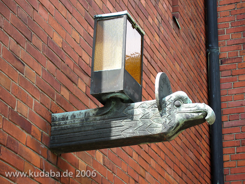 Katholische Kirche St. Bernhard in Berlin-Dahlem von Wilhelm Fahlbusch von 1932 – 1934, Detailansicht der Außenlampe in Form eines Adlerkopfes als Symbol für den Evangelisten Johannes