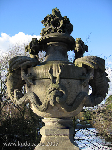 Bismarckbrücke in Grunewald, Berlin-Wilmersdorf, Detailansicht des Brückengeländers: Sandsteinskulptur