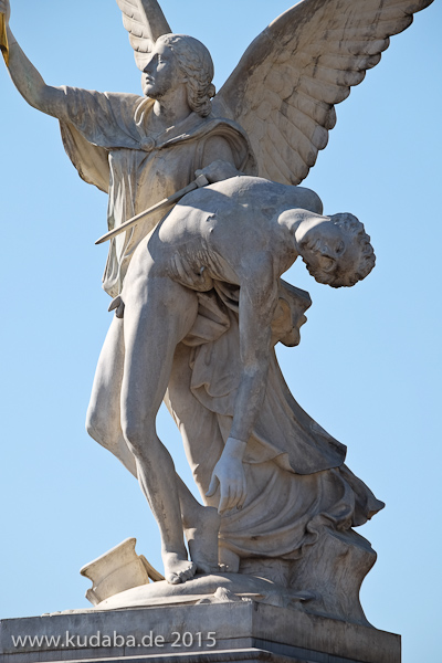 Die Skulptur „Nike trägt den gefallenen Krieger zum Olymp empor“ auf der Schlossbrücke in Berlin-Mitte aus weißem Carrara-Marmor stammt von dem deutschen Bildhauer August Julius Wredow aus dem Jahr 1857.