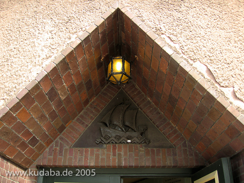 Keramik-Relief mit Schiff über einer Eingangstür