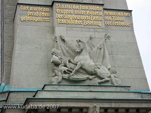 Gedenkturm in Großbeeren von 1913, Darstellung eines Pferdes mit Kanonen, Offiziershelm und Heeresbanner